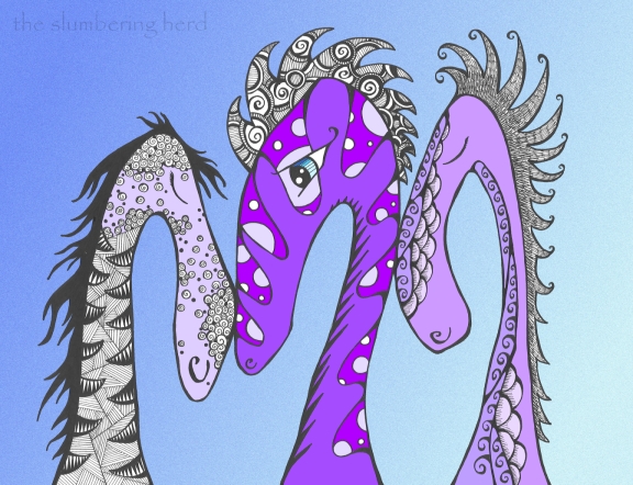 Three Long Necks, Purple ← Previous Next → It’s too bad I couldn’t fit all of them into the shot, as all three were rug-hooking like fiends. Dozing off only cuts their productivity by about forty percent, but just as I got this shot Grapeseed was startled awake by a passing trolley.
